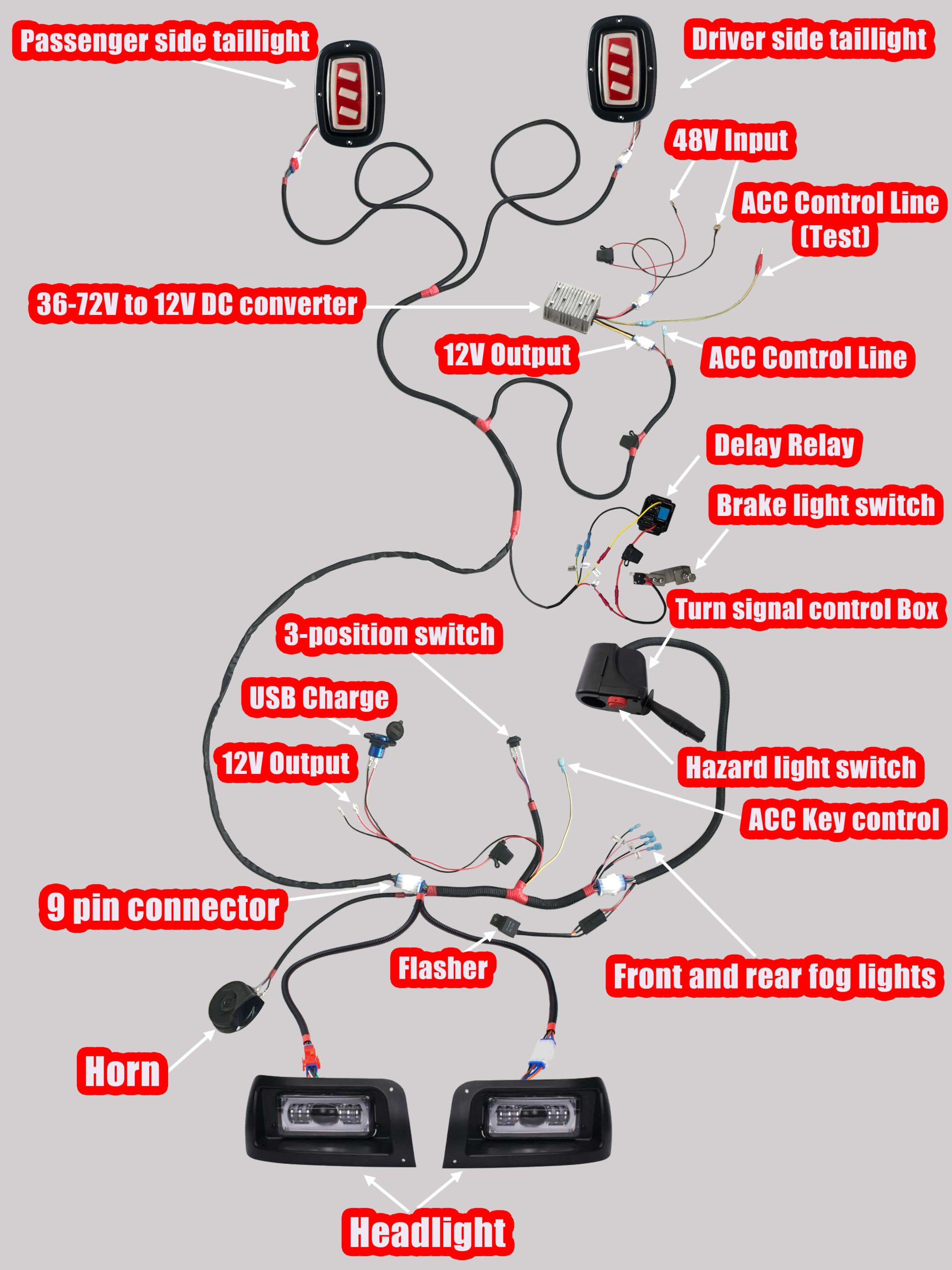 - Kit Includes: New style LED headlights & tail lights, Automotive style turn signal stalk, 240W 20A 36-72V to 12V DC converter, Aluminum alloy Quick Charge 3.0 dual USB charger socket, Mechanical brake switch, Copper wire snail horn, Wiring harness, installation hardware, Hole opener & installation instructions