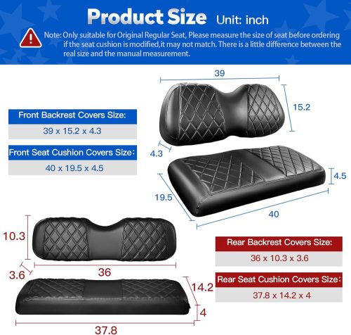 Golf cart front seat cover: NOKINS Front Seat Covers is only suitable for CLUB CAR PRECEDENT OEM STANDARD SEAT CUSHIONS. Note: Not suitable for PREMIUM seat cushions. Please measure the size before purchasing. Size: Golf Cart Front seat cushion cover: ( 40X19.5X4.5 in)+Backrest cover: ( 39X15.2X4.3 in).