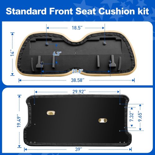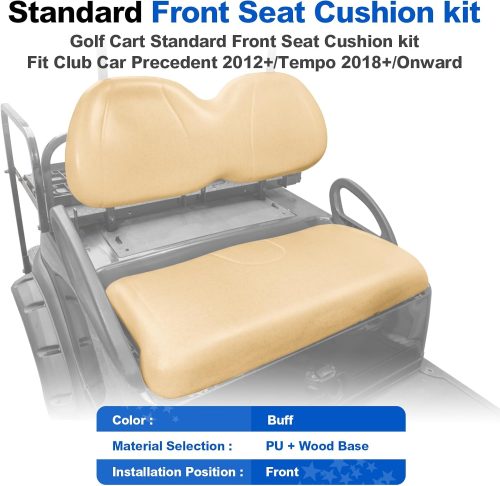 - Models: The golf cart standard front seat cushion Kit (Buff) is very suitable for Club Car Precedent Since 2012/Club Car Tempo Since 2018 Golf Cart. Seat Cushion Size about: 39×19.49×4.5 inches, Backrest Size about: 38.58x14x4.3 inches.(REPLACEMENT FRONT CUSHIONS KIT, NOT SUITABLE FOR GOLF CARTS REAR SEAT.)
